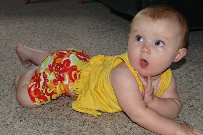Karley is such a goof. I was laying on the couch and Karley was crawling all over the jungle gym, err, me, and I started blowing raspberries on her. She turned around and put her mouth right on mine and blew raspberries right back. A little while later she was playing with a spoon and she came over to me, lifted my shirt and stuck the spoon in my belly button. A few minutes after that she ran over and started dancing in front of the mirror on our closet door and started giggling at her reflection... she was really rockin' out over there!