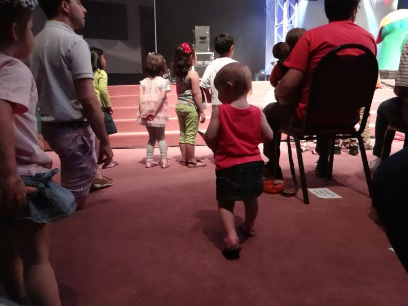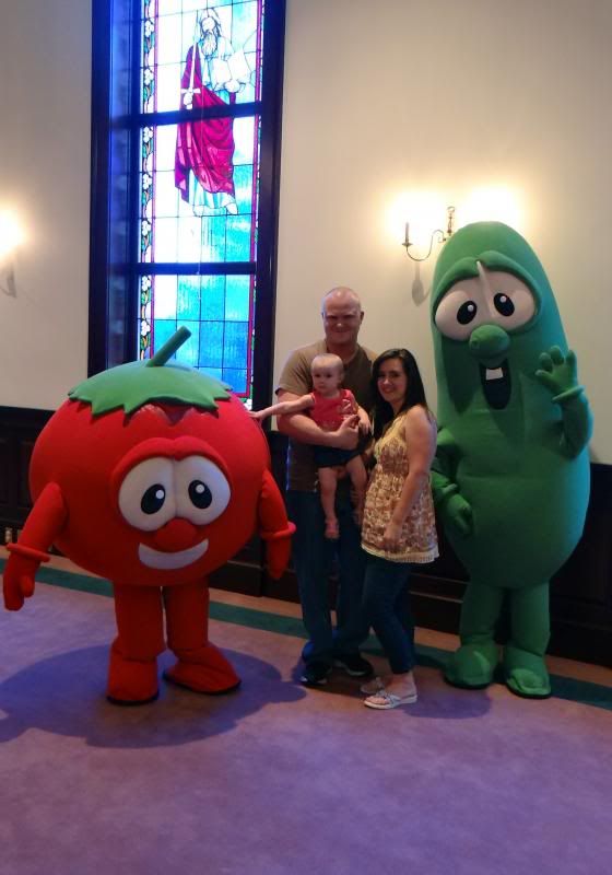 Yesterday was Veggie Tales Live! We had so much fun! Little Miss Independent even crawled off my lap and ran to the front to dance with the other kids - no prompting from me at all. A bunch of kids were all running towards the front and she decided she wanted to go to. BABY MOSH PIT! We even got to "meet" Bob and Larry. I'm glad she did freak out like she did with the Easter bunny. She touched Bob. Apparently tomatoes aren't as scary as giant bunny rabbits.